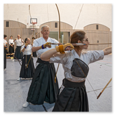 Auch diesmal war ein neues "Panorama-Banner" (japanisch: Taremaku) über die gesamte Breite der Azuchi (Zielbereich) gespannt. Nach einführenden Worten von Lilo zu Eigenschaften und Besonderheiten des Feuer-Pferds konnte der "Wettkampf" um die vielen Motiv-Scheiben und Matos mit zwei Heulpfeilen (japanisch: Kabura-ya) "angepfiffen" werden.