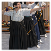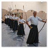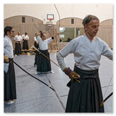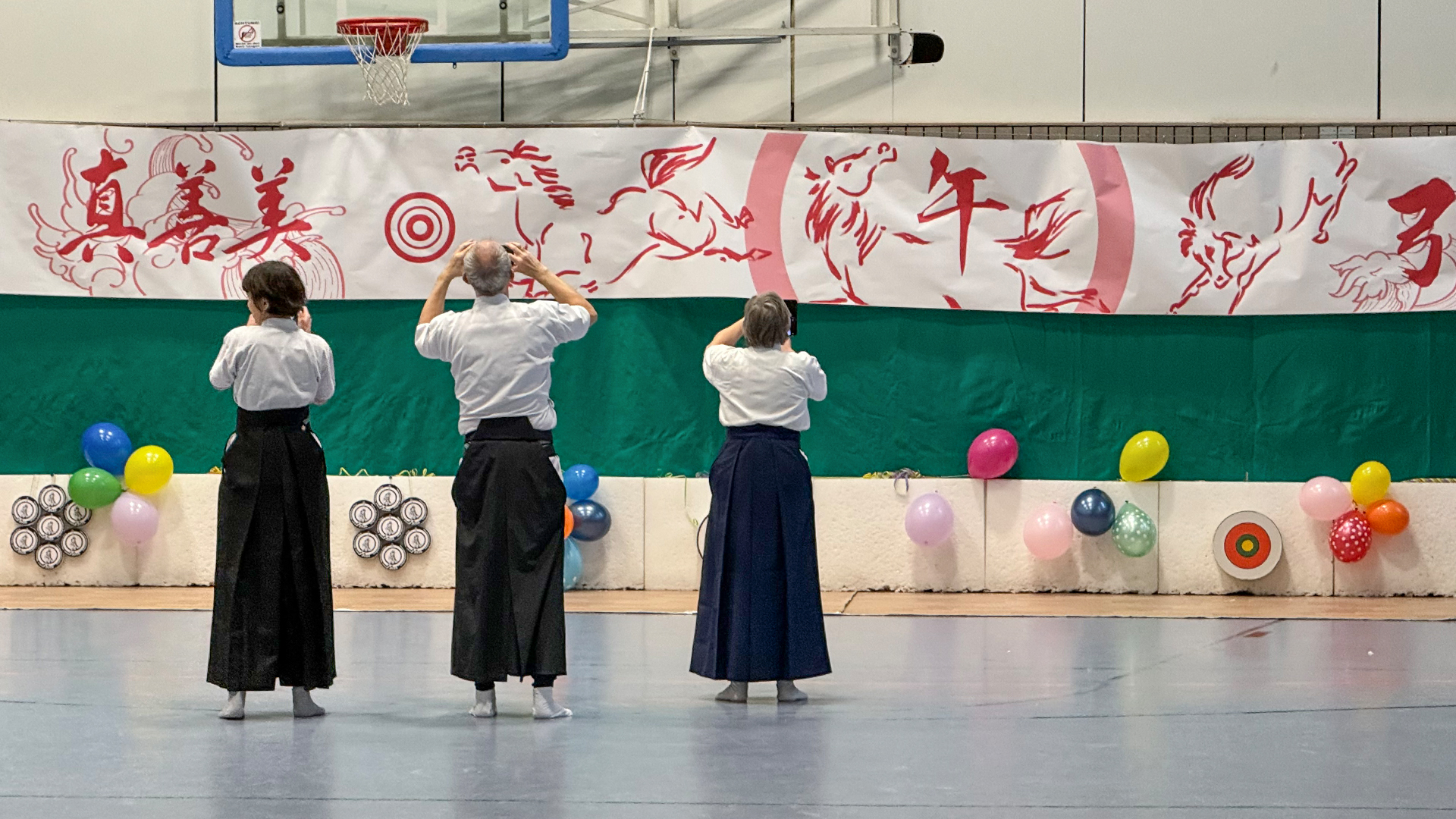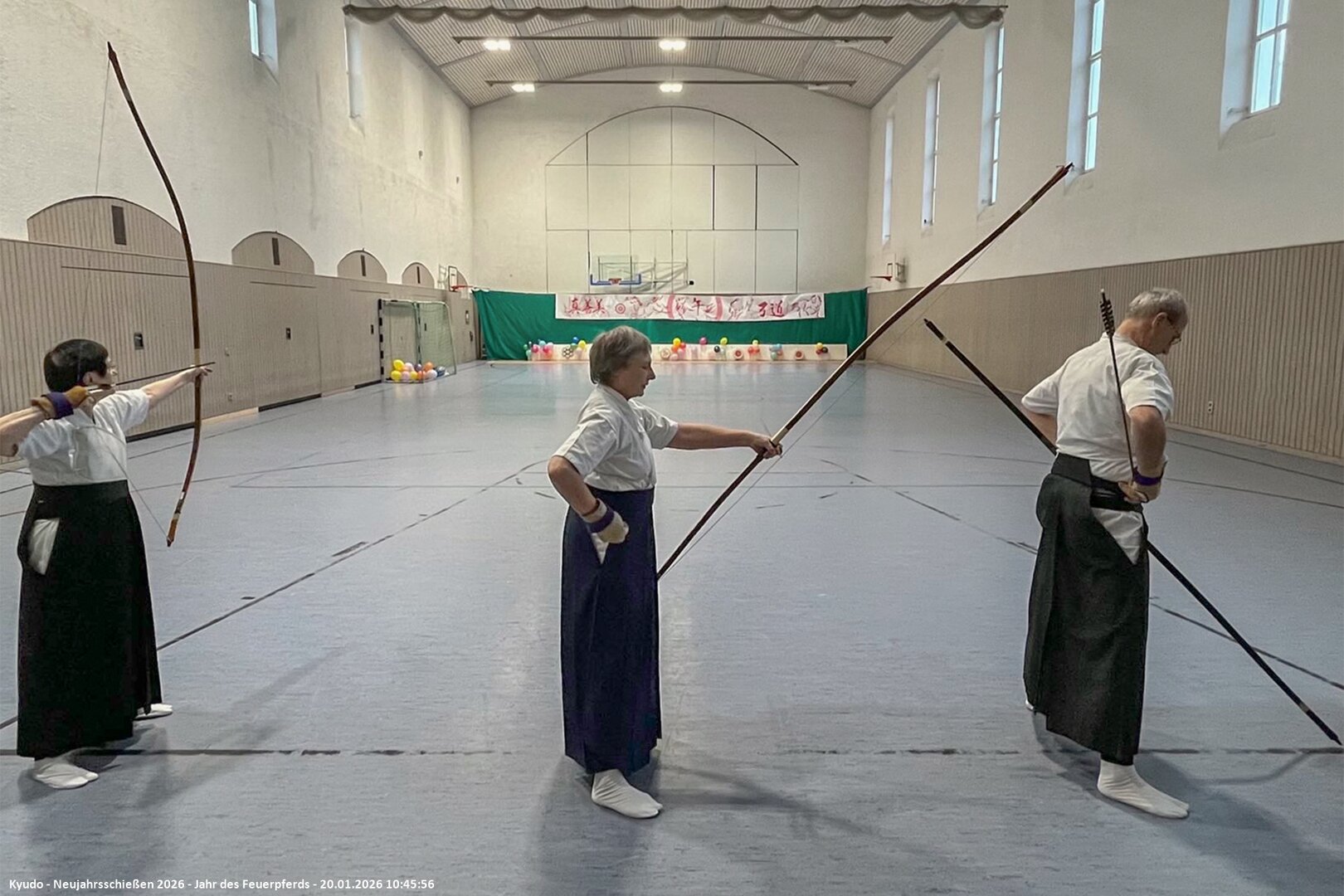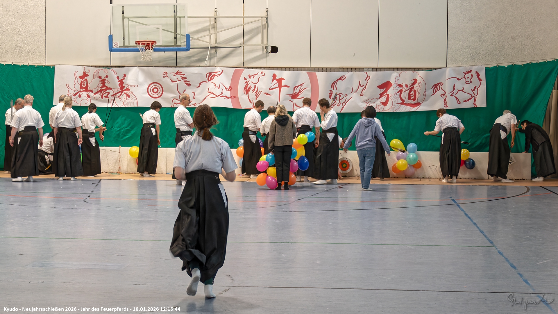 Auch diesmal war ein neues "Panorama-Banner" (japanisch: Taremaku) über die gesamte Breite der Azuchi (Zielbereich) gespannt. Nach einführenden Worten von Lilo zu Eigenschaften und Besonderheiten des Feuer-Pferds konnte der "Wettkampf" um die vielen Motiv-Scheiben und Matos mit zwei Heulpfeilen (japanisch: Kabura-ya) "angepfiffen" werden.